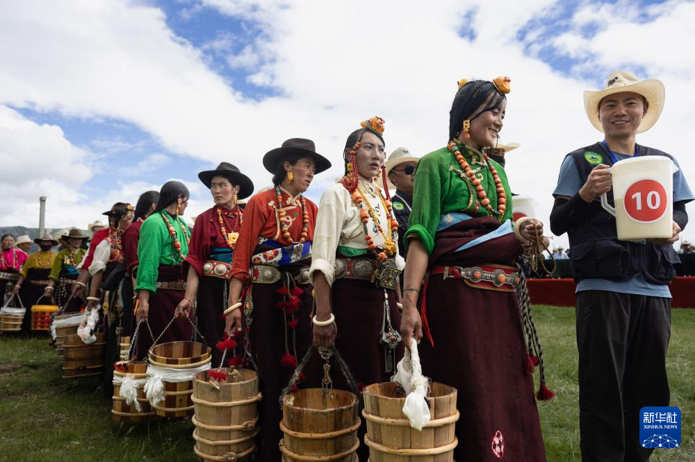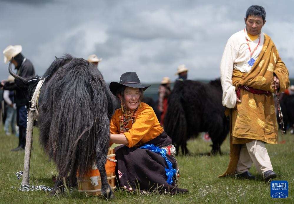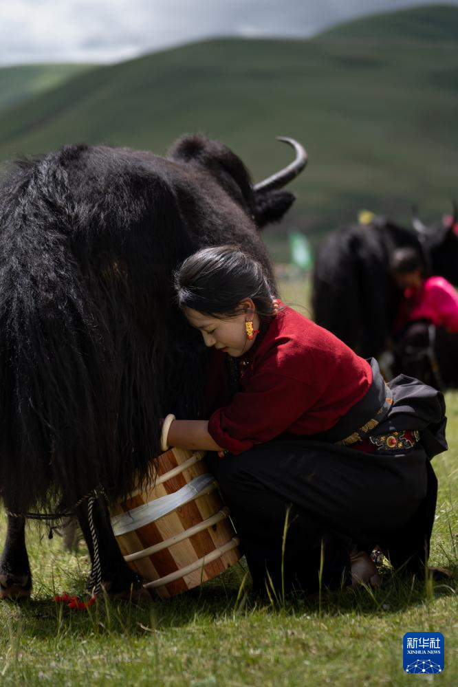 7月27日,在四川省白玉县日通草原上,当地妇女在参与牦牛挤奶比赛。