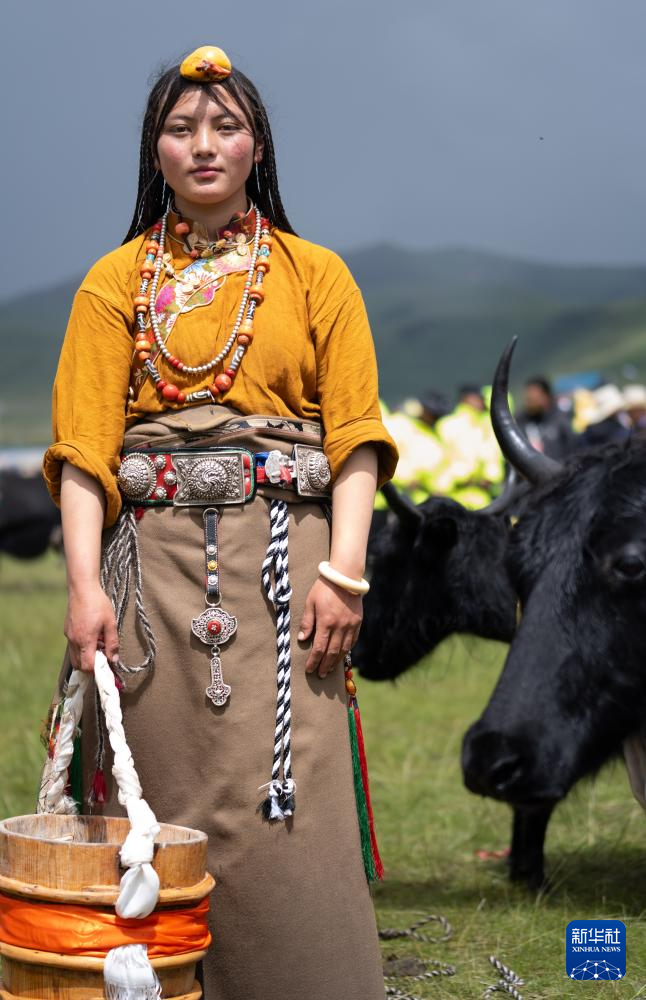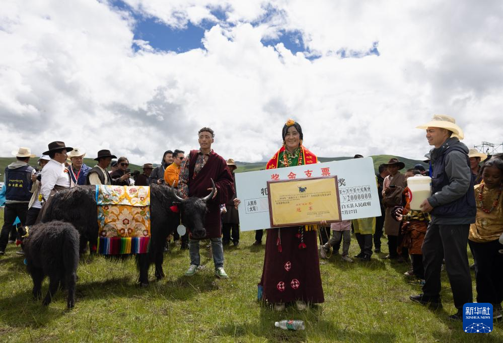 7月27日,牦牛挤奶比赛中冠军选手获得奖励。