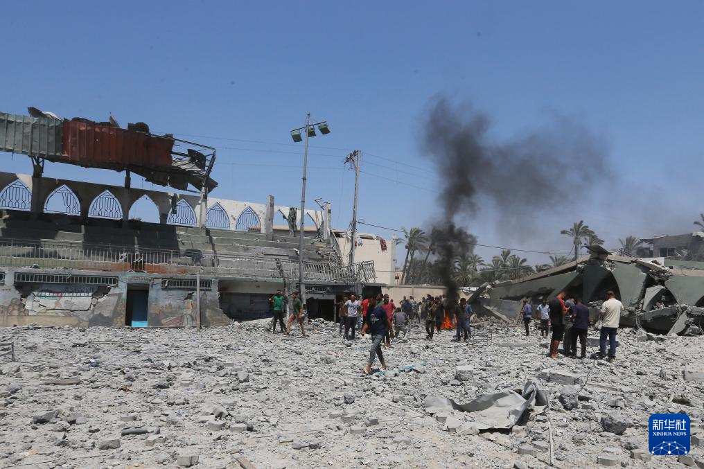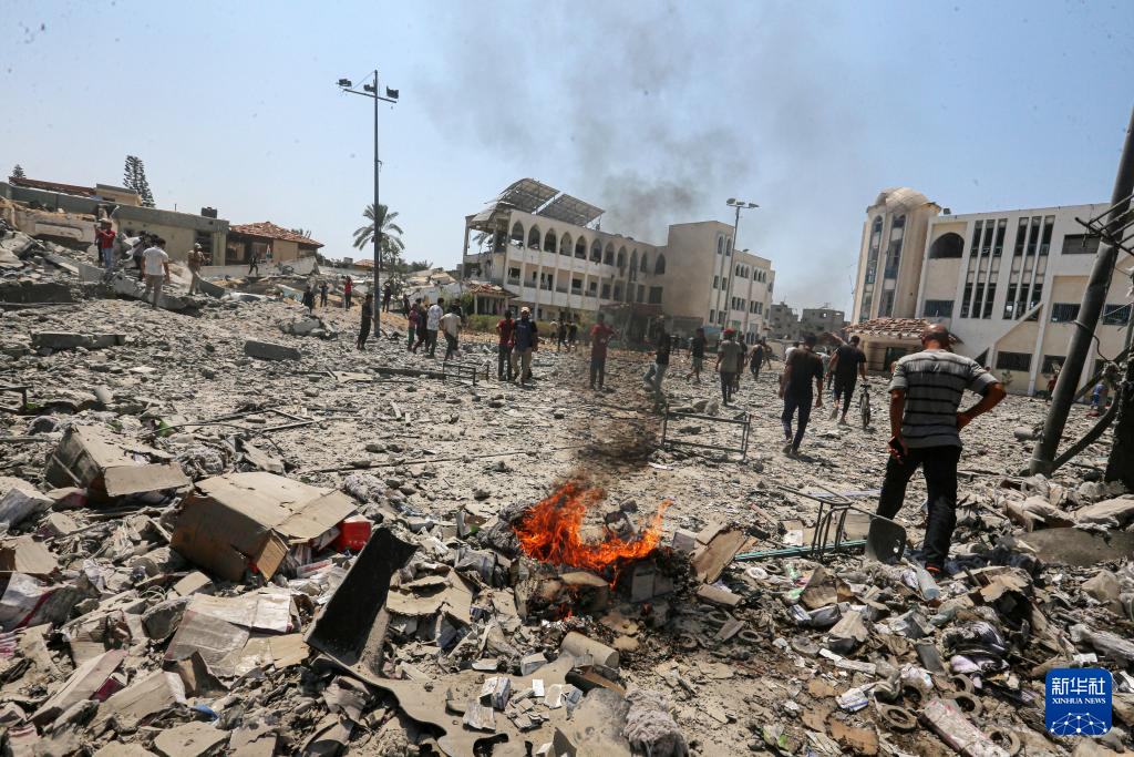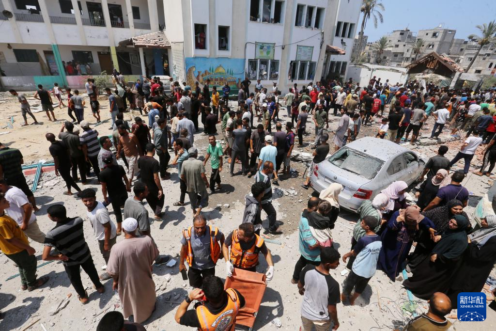 7月27日,在加沙地带中部城市代尔拜拉赫,人们聚集在以军袭击现场附近。
