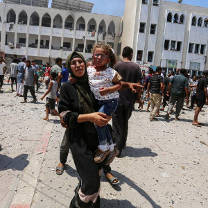 7月27日,在加沙地带中部城市代尔拜拉赫,一名妇女抱着一名受伤的儿童。