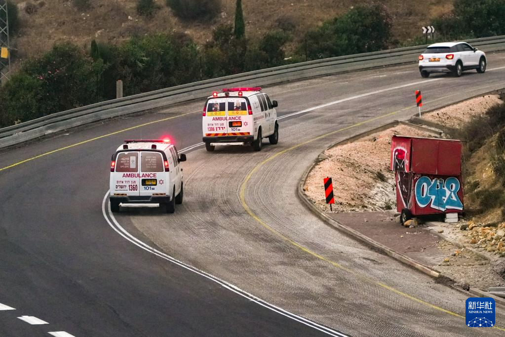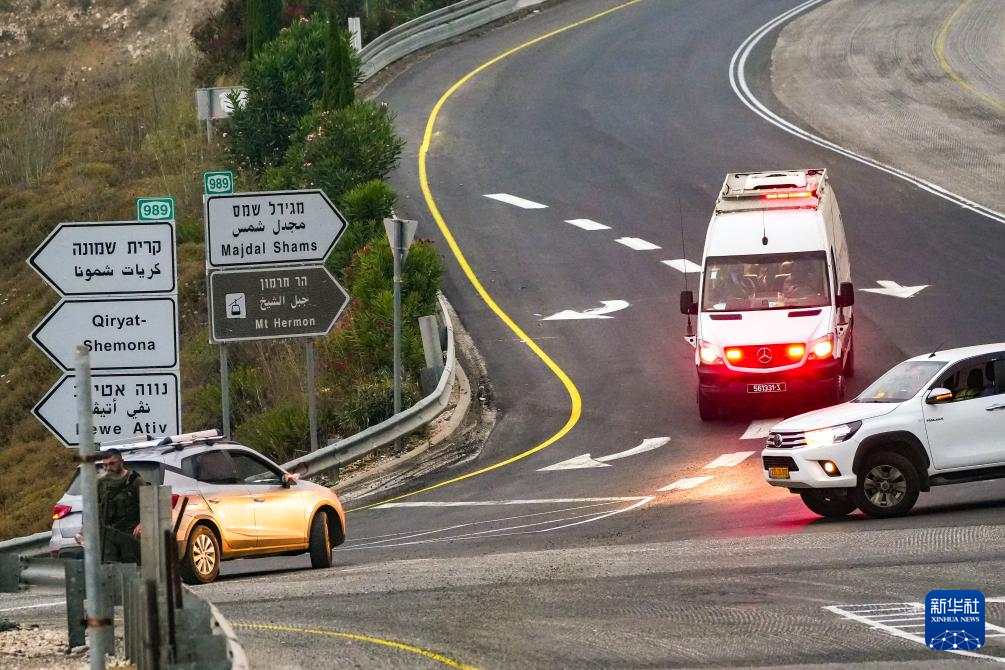 7月27日,在以色列占领的戈兰高地城镇迈季代勒舍姆斯,救护车在火箭弹袭击现场附近转移伤员。