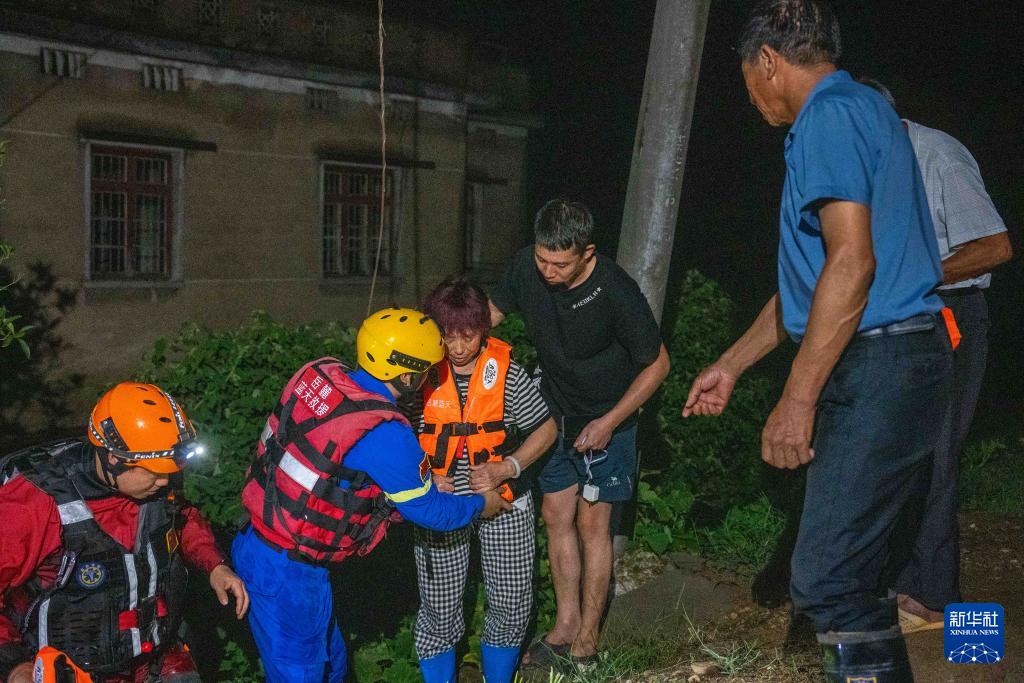 7月29日凌晨,在湖南省湘潭县易俗河镇四新堤附近,抢险人员在转移被困群众。