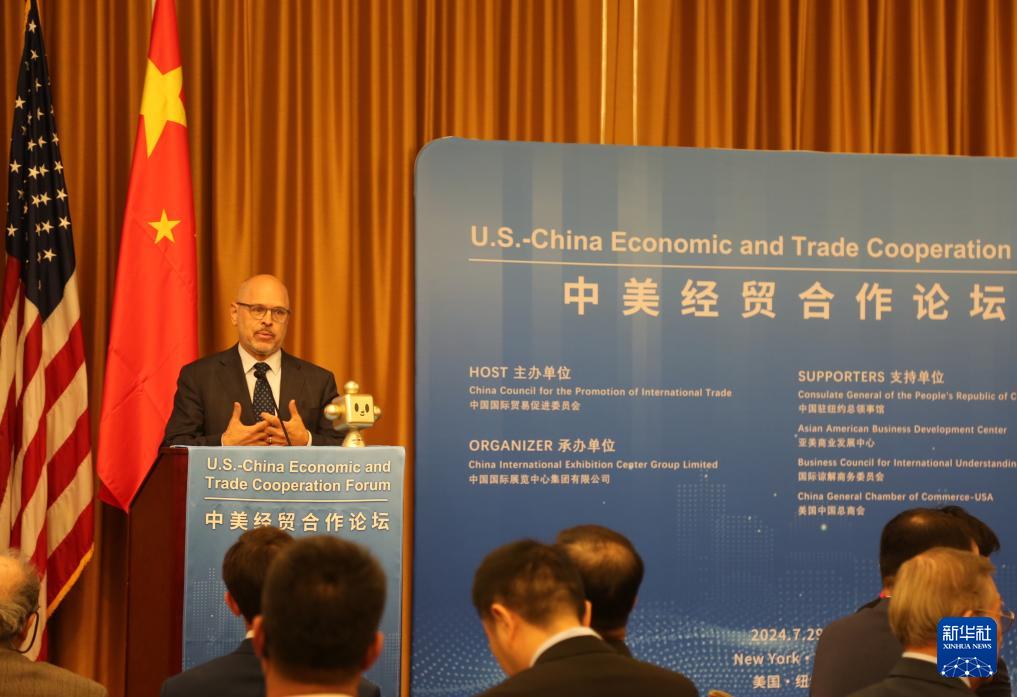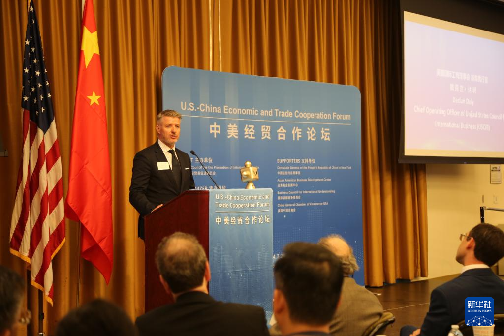 7月29日,在美国纽约,美国国际工商理事会首席运营官戴克兰·达利在中国—美国经贸合作论坛上致辞。