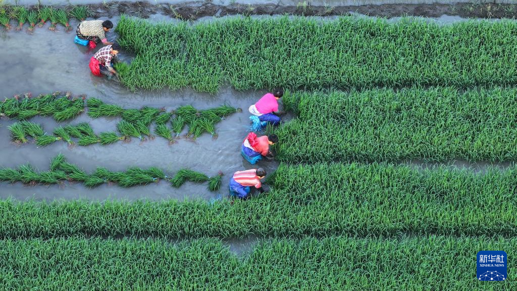 7月30日,在湖南省娄底市双峰县井字镇花山村,农民在田间起秧(无人机照片)。