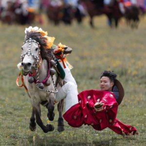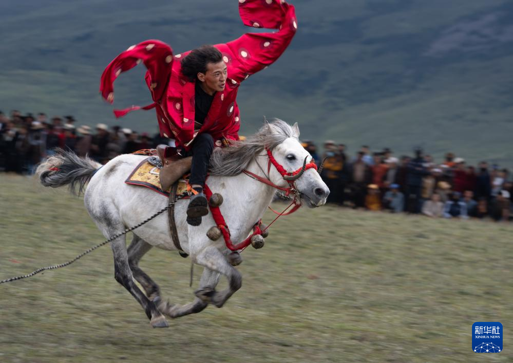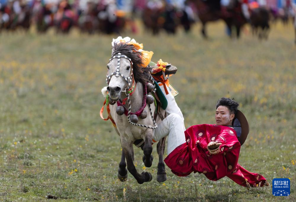 7月30日,在理塘县多旺塘赛马场,一名康巴汉子展示五彩凌空。