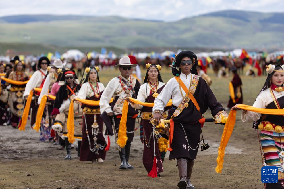 7月30日,在理塘县多旺塘赛马场,来自理塘县高城镇的方队展示传统民族服饰。