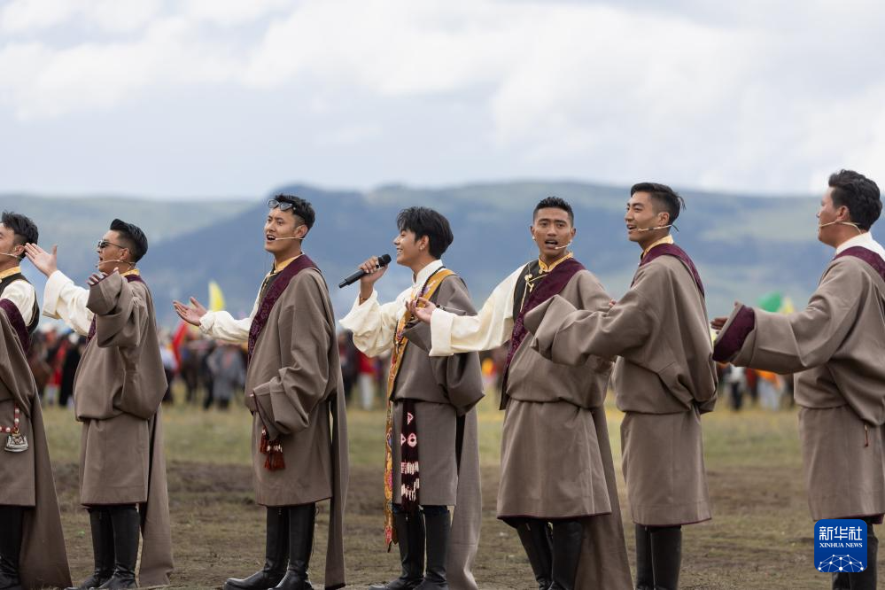 7月30日,在理塘县多旺塘赛马场,来自理塘县的丁真珍珠与其他本土歌手演唱歌曲。