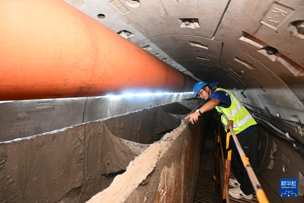 7月30日,工作人员在雨水主管隧道内检查盾构管片。
