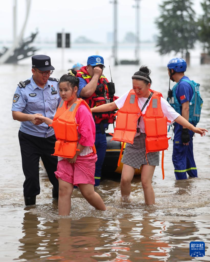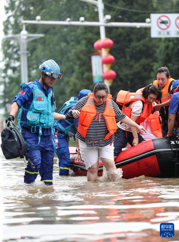 7月30日,在丹东市,救援人员将受困群众转移至安全区域。