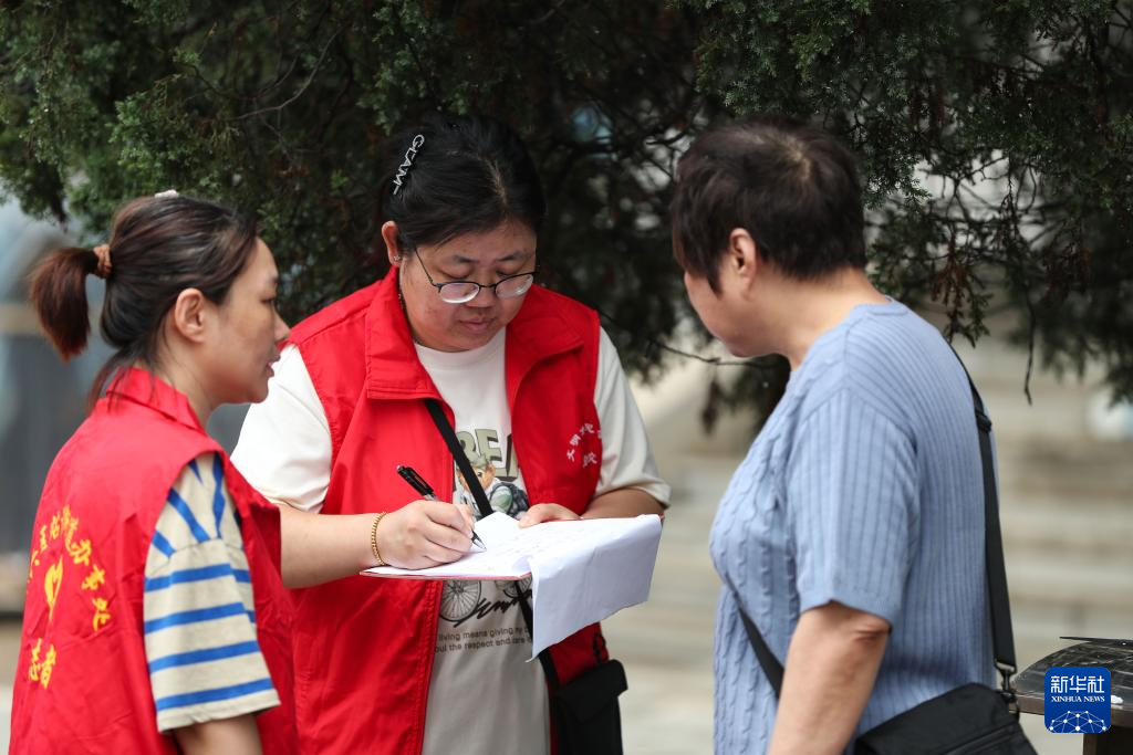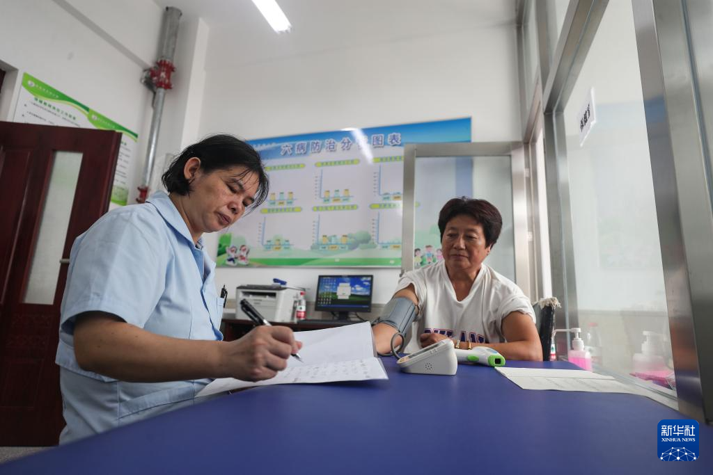 7月30日,在丹东市五纬小学安置点,医务人员为受助群众测量血压。