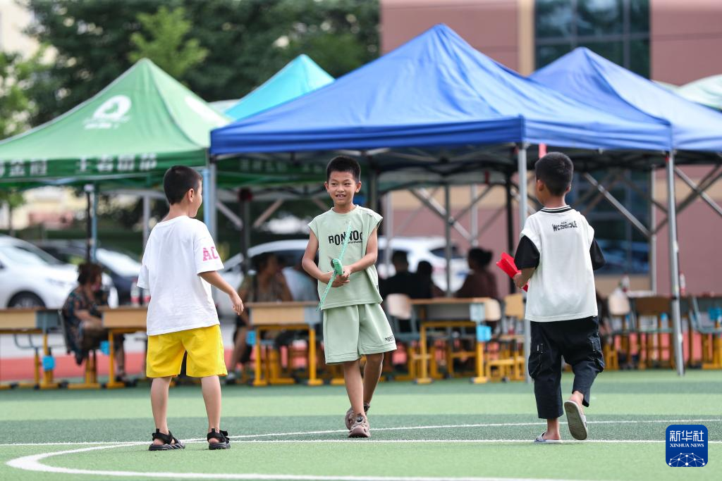 7月30日,小朋友在丹东市五纬小学安置点玩耍。