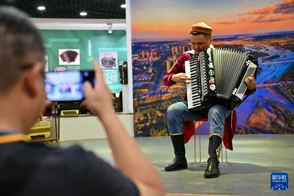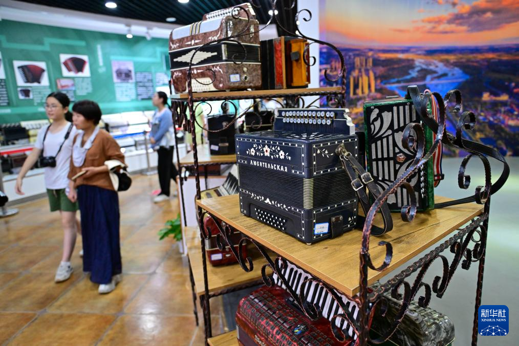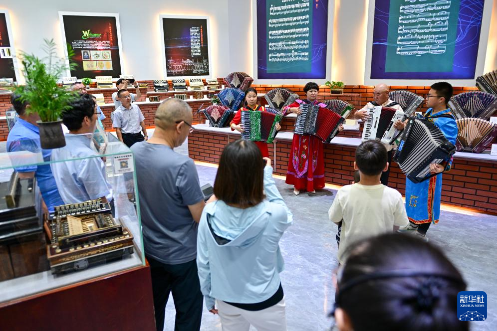 游客在新疆塔城市手风琴文化展示厅欣赏手风琴表演(7月24日摄)。