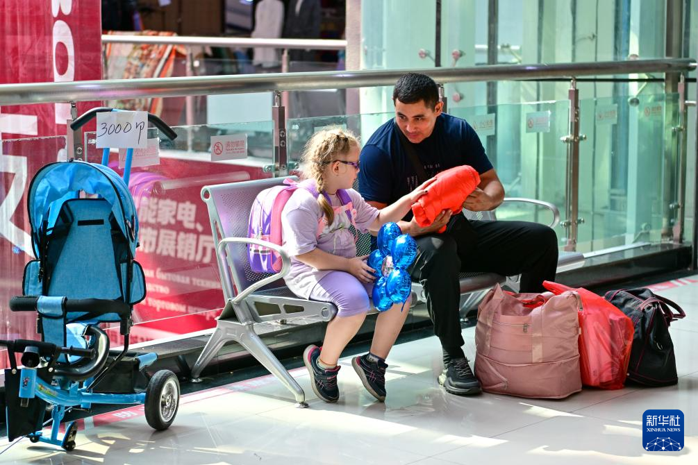 在中哈霍尔果斯国际边境合作中心,来自哈萨克斯坦的游客在购物后休息(7月27日摄)。
