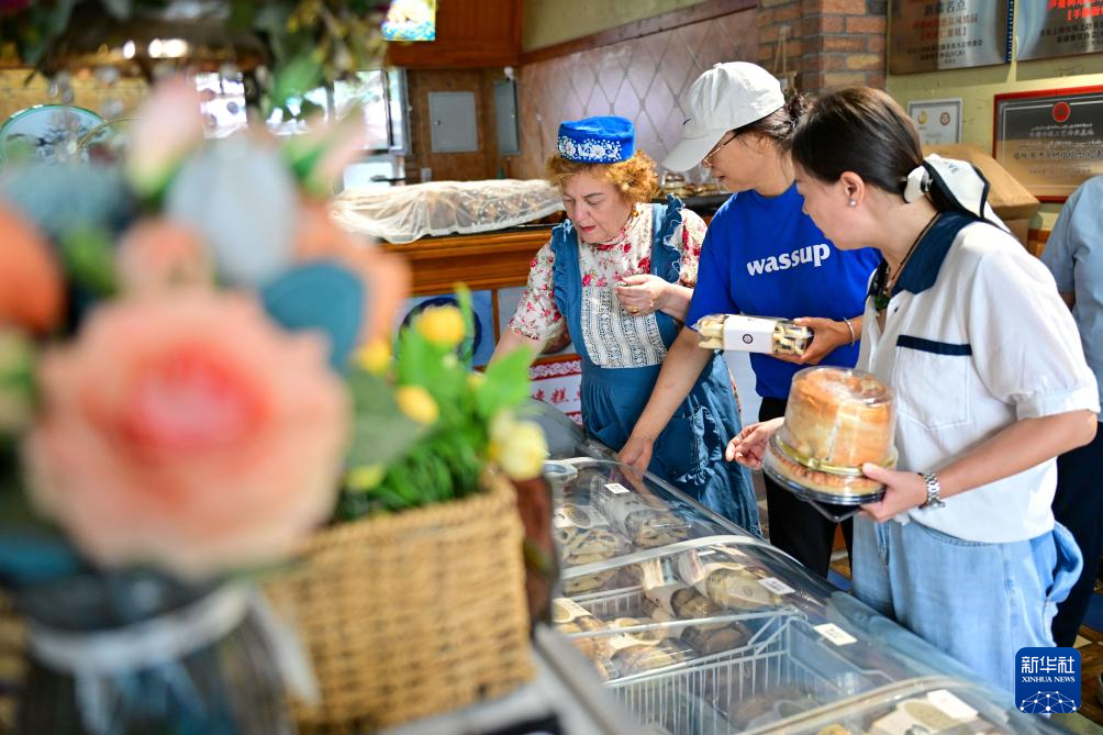 在新疆塔城市,顾客在挑选塔塔尔族传统糕点(7月24日摄)。