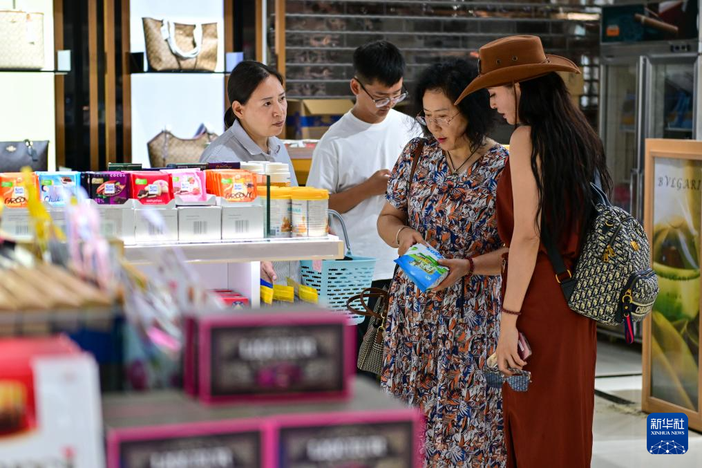 在中哈霍尔果斯国际边境合作中心,游客在免税店挑选商品(7月26日摄)。