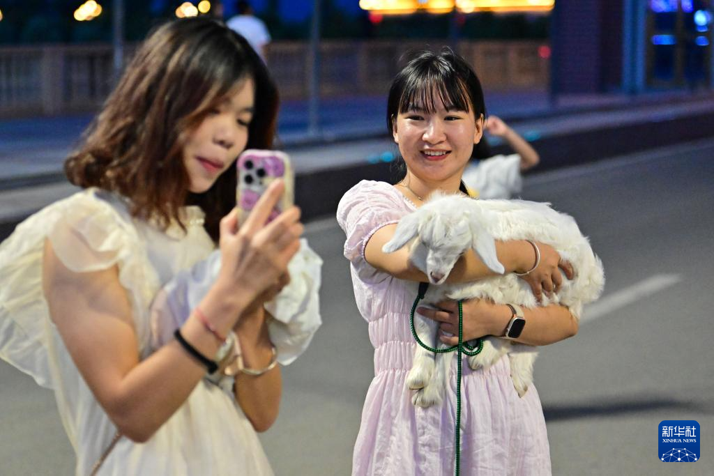 游客在新疆布尔津县七彩河休闲旅游度假区抱着小羊拍照(7月21日摄)。