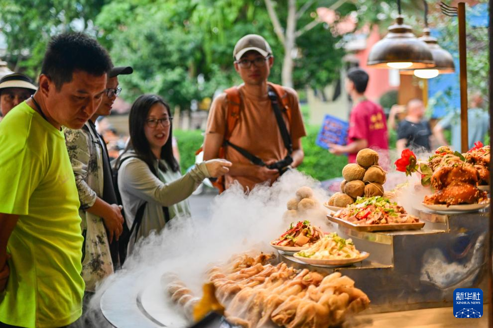 在伊犁哈萨克自治州伊宁市六星街,游客购买当地美食(7月28日摄)。