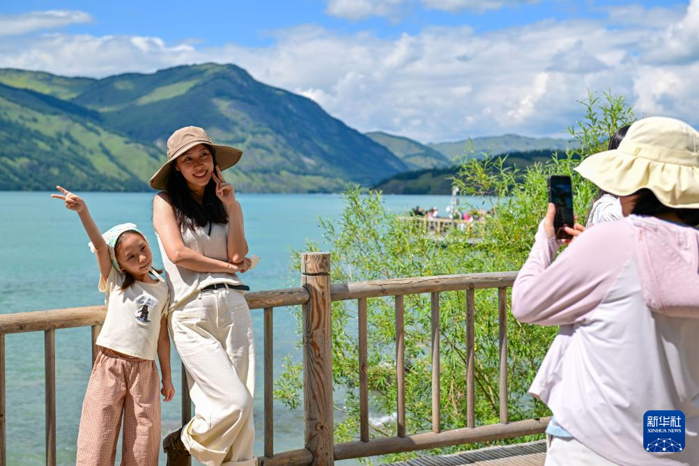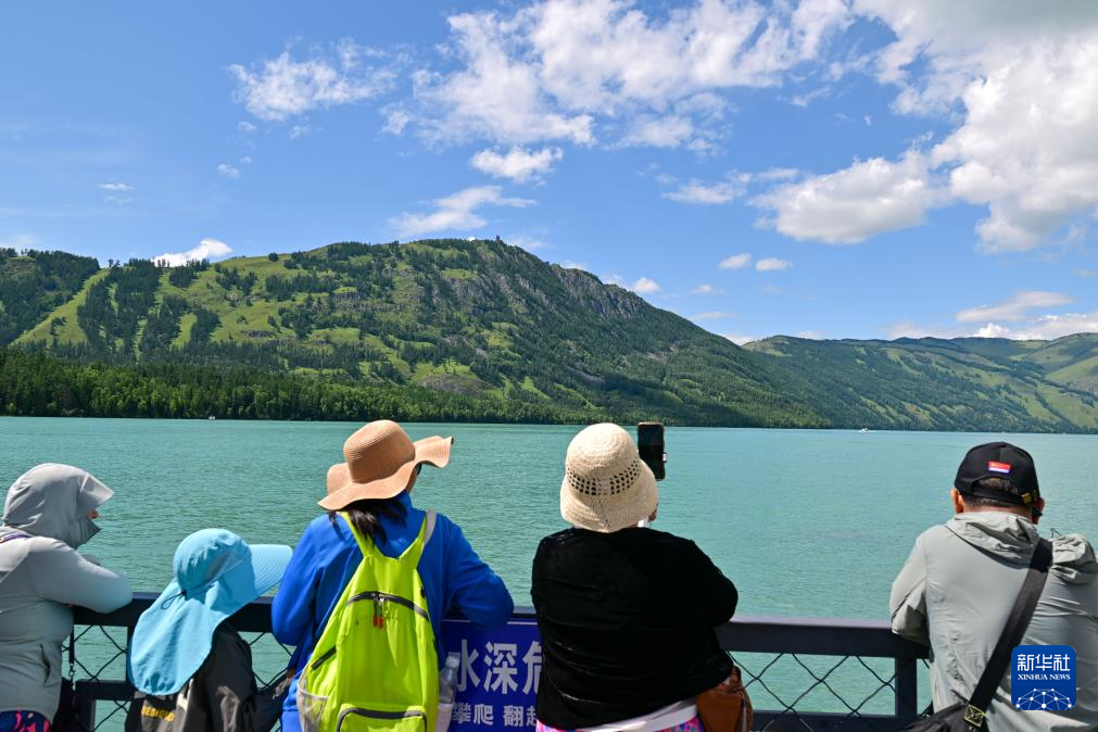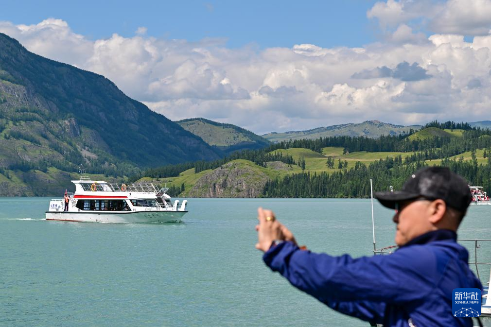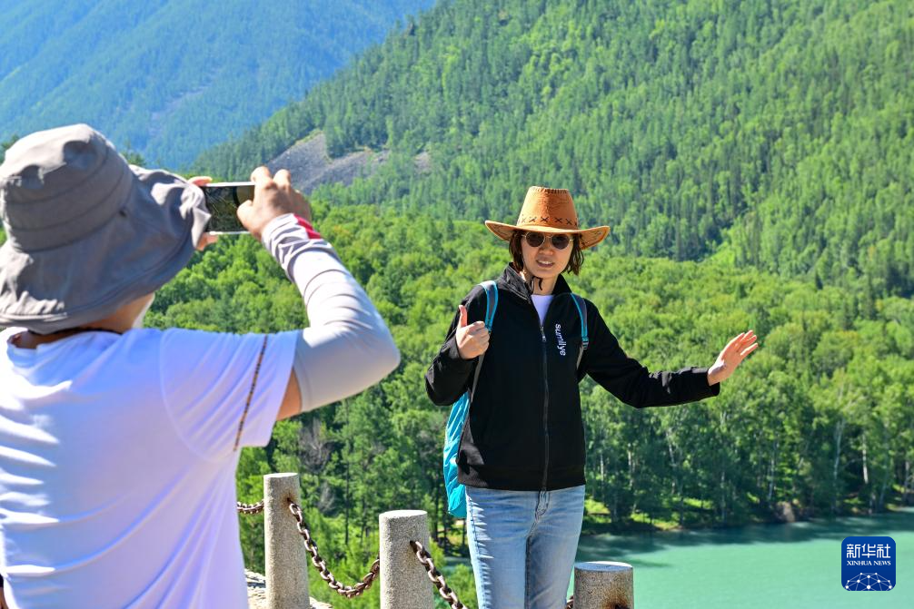 游客在新疆阿勒泰地区喀纳斯景区观光游览(7月22日摄)。