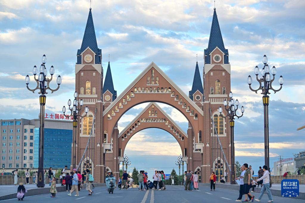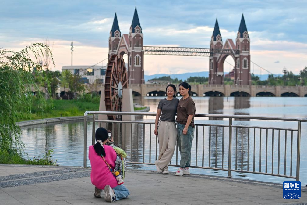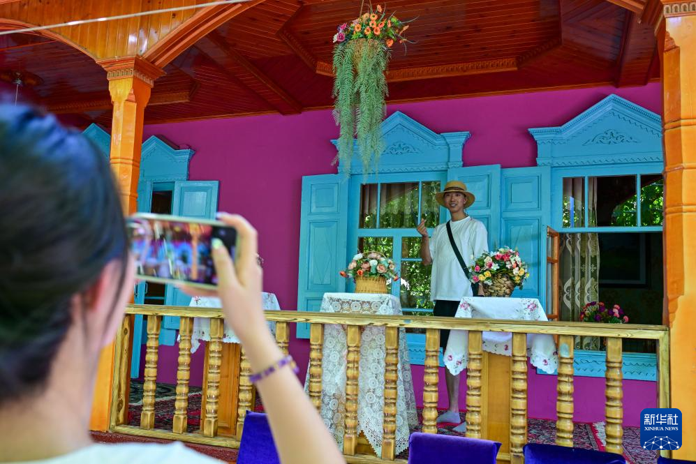 在伊犁哈萨克自治州伊宁市喀赞其民俗旅游区,游客在特色民宿拍照打卡(7月27日摄)。