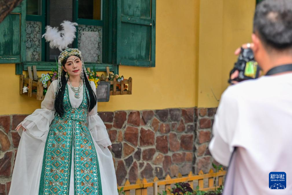 在伊犁哈萨克自治州伊宁市六星街,游客体验旅拍项目(7月27日摄)。