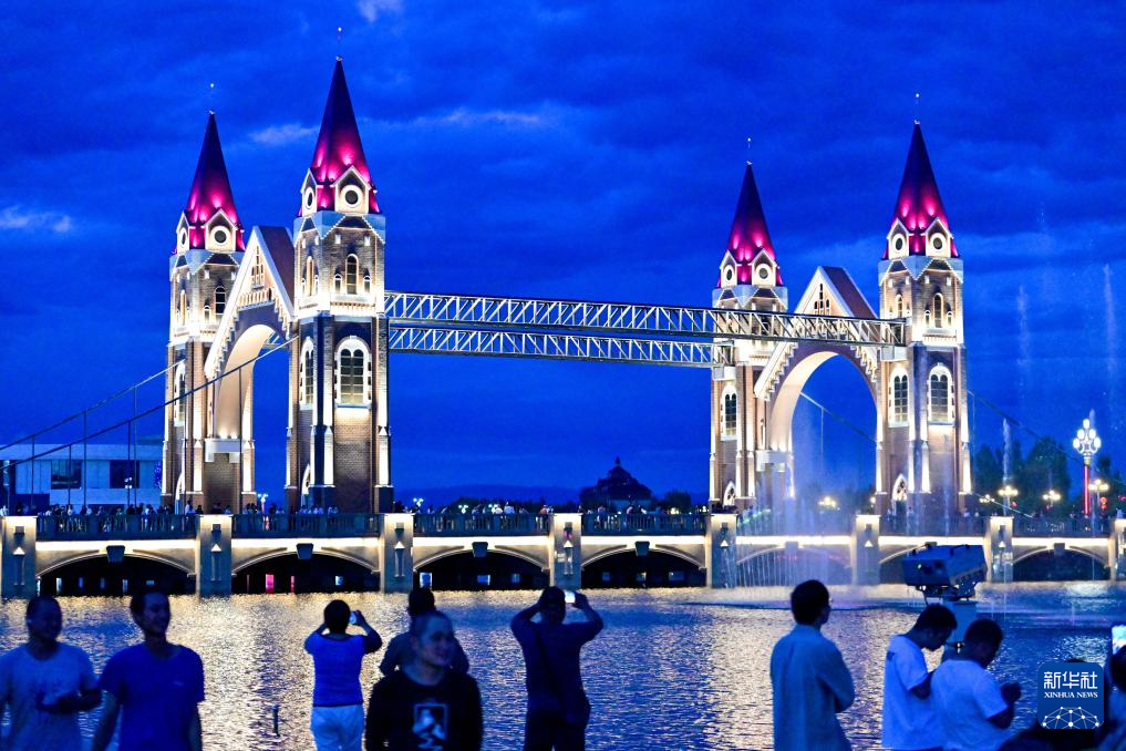 在伊犁哈萨克自治州伊宁市喀赞其民俗旅游区,游客在锡伯车马店欣赏文艺表演(7月27日摄)。
