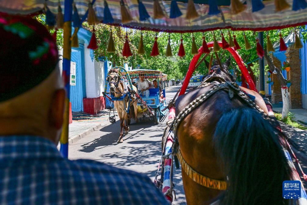 在伊犁哈萨克自治州伊宁市喀赞其民俗旅游区,游客乘坐马车观光游览(7月27日摄)。