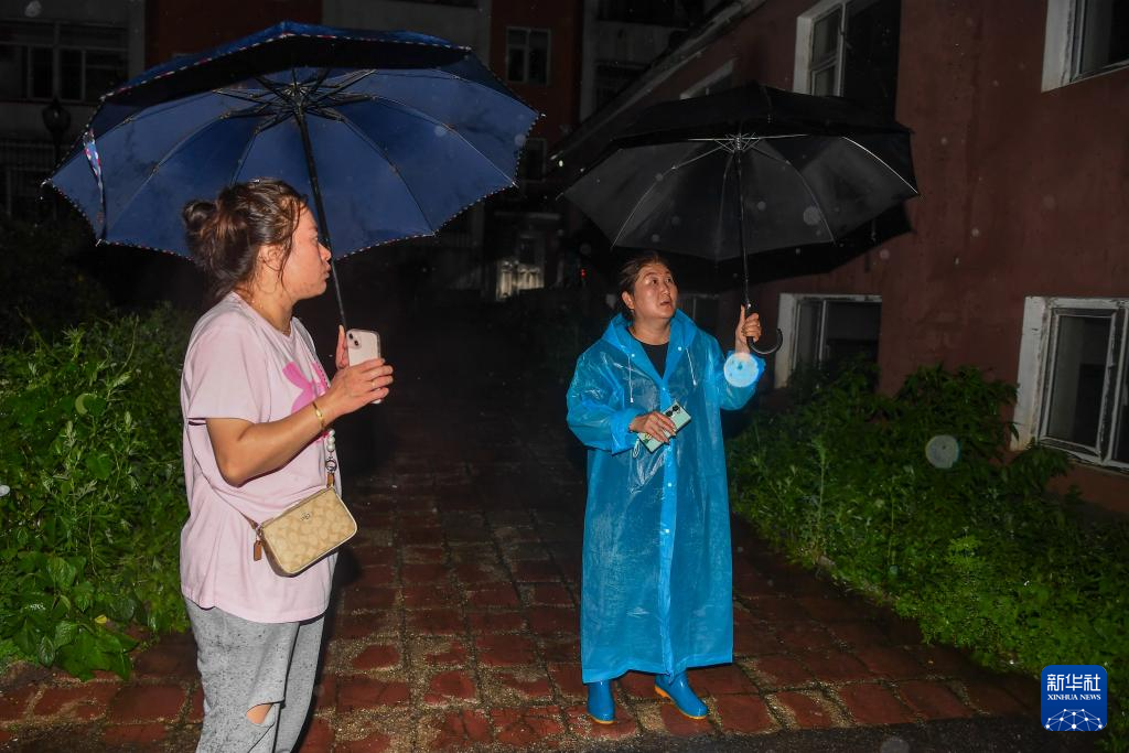 7月29日,在吉林省临江市,建国街道台兴社区党委书记孙爱武(右)和同事在怡景花园小区排查人员安置情况。