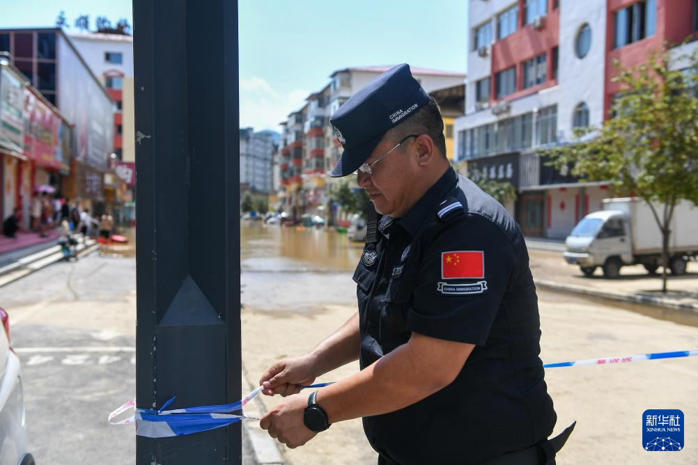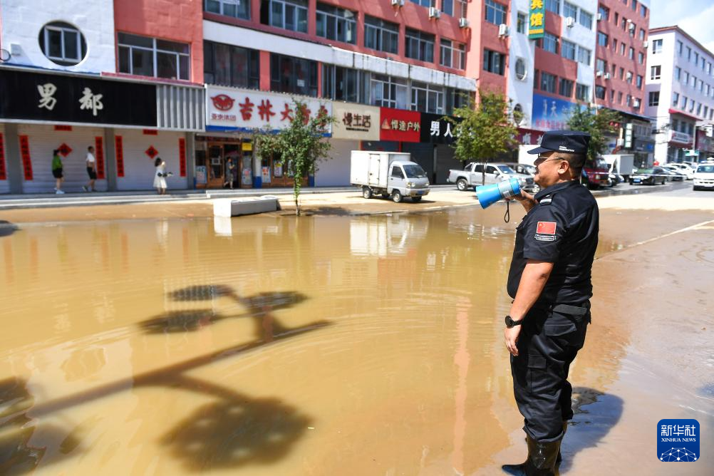 7月29日,在吉林省临江市,建国边境派出所所长赵旭烨在内涝区域路口设置警戒线。