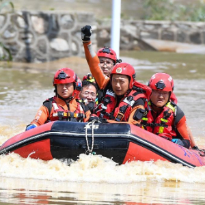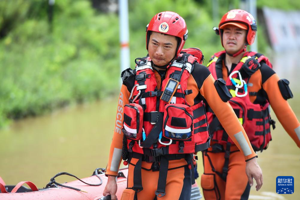 7月29日,在吉林省临江市,临江市消防救援大队世纪大街站副站长白云天(左)与队员一起搬运橡皮艇。