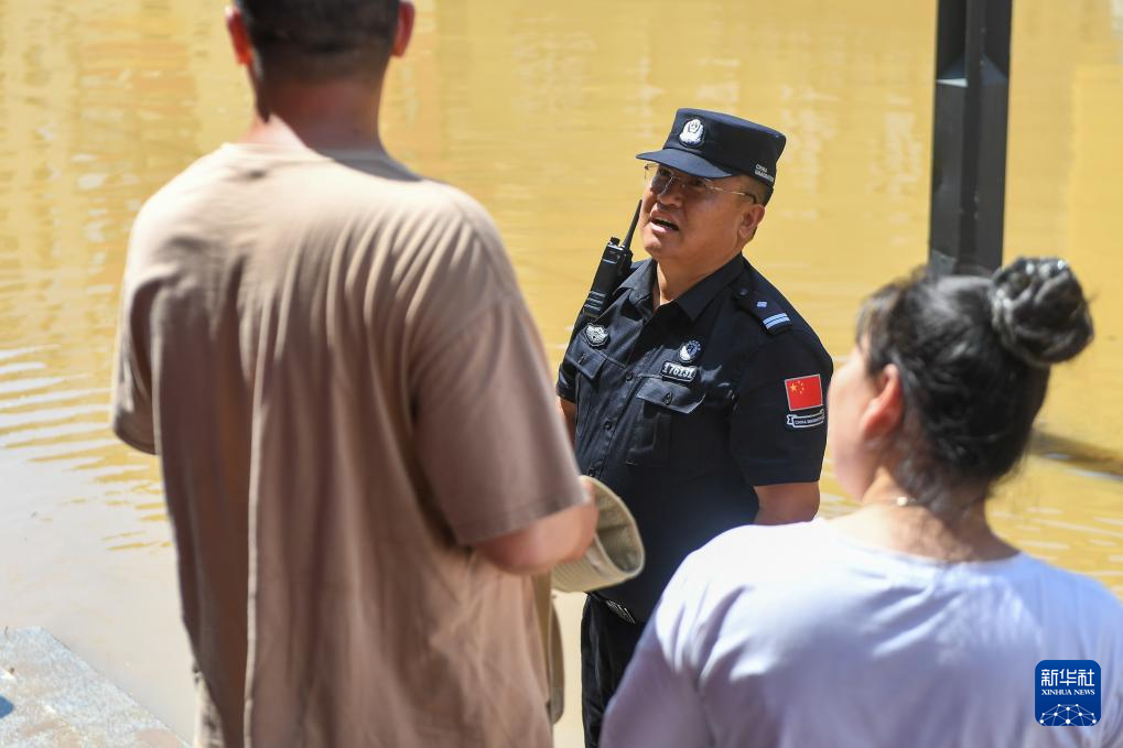 7月29日,在吉林省临江市,建国边境派出所所长赵旭烨(中)劝导市民不要冒险涉水通行。