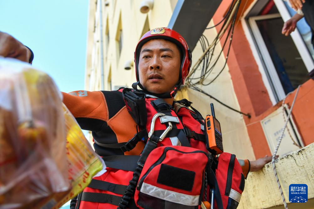 7月29日,在吉林省临江市,临江市消防救援大队世纪大街站副站长白云天为受困群众运送食品。