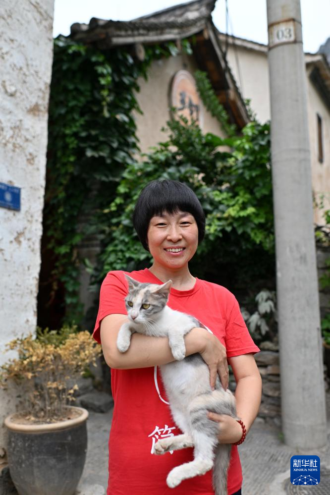 在山西省平顺县榔树园村,魏美玲抱着猫站在民宿前(7月24日摄)。