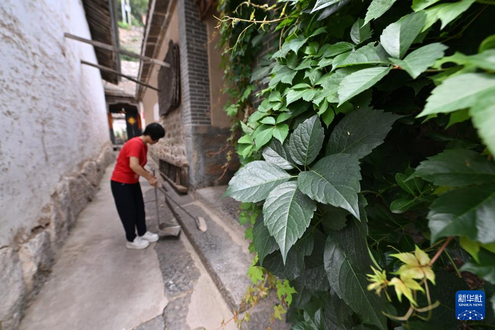 在山西省平顺县榔树园村,魏美玲在民宿前打扫卫生(7月24日摄)。