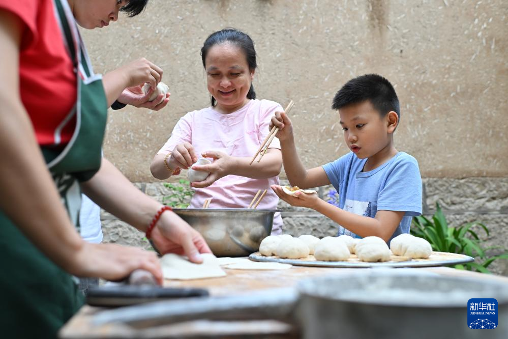 在山西省平顺县榔树园村,住在民宿的客人和魏美玲一起包包子(7月24日摄)。