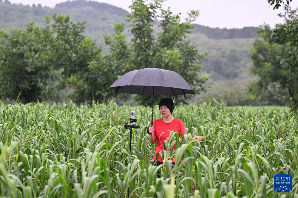在山西省黎城县岩井村的谷子地里,魏美玲通过网络直播介绍小米生长情况(7月25日摄)。