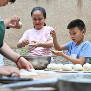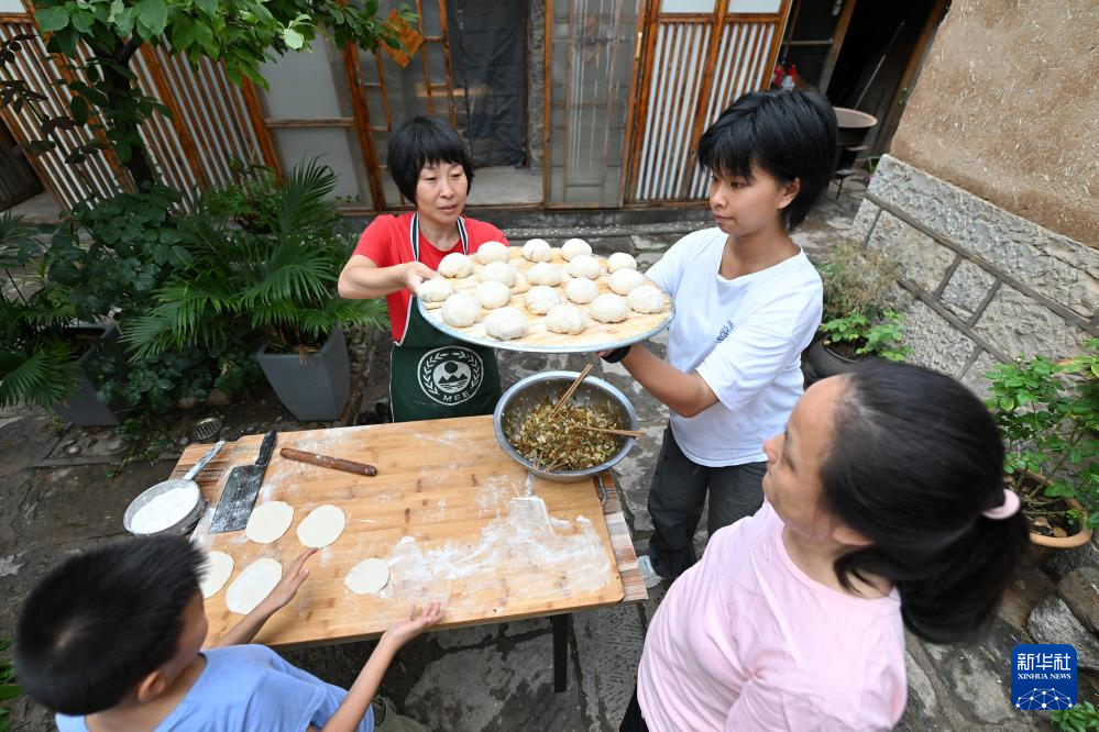 在山西省平顺县榔树园村,魏美玲(左后)和住在民宿的客人一起包包子(7月24日摄)。