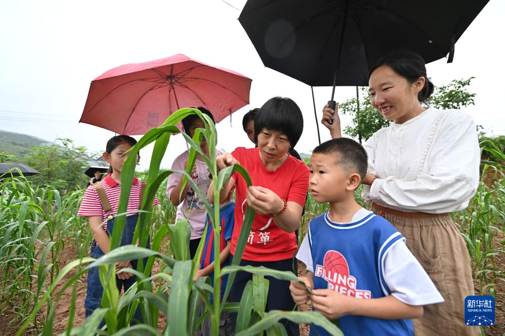 在山西省黎城县岩井村的谷子地里,魏美玲(右三)向住在民宿的孩子们介绍小米的特点(7月25日摄)。