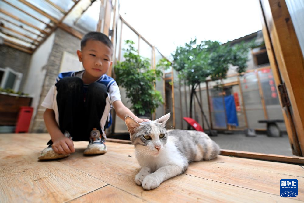 在山西省平顺县榔树园村,住在民宿的孩子在抚摸民宿养的一只猫(7月25日摄)。
