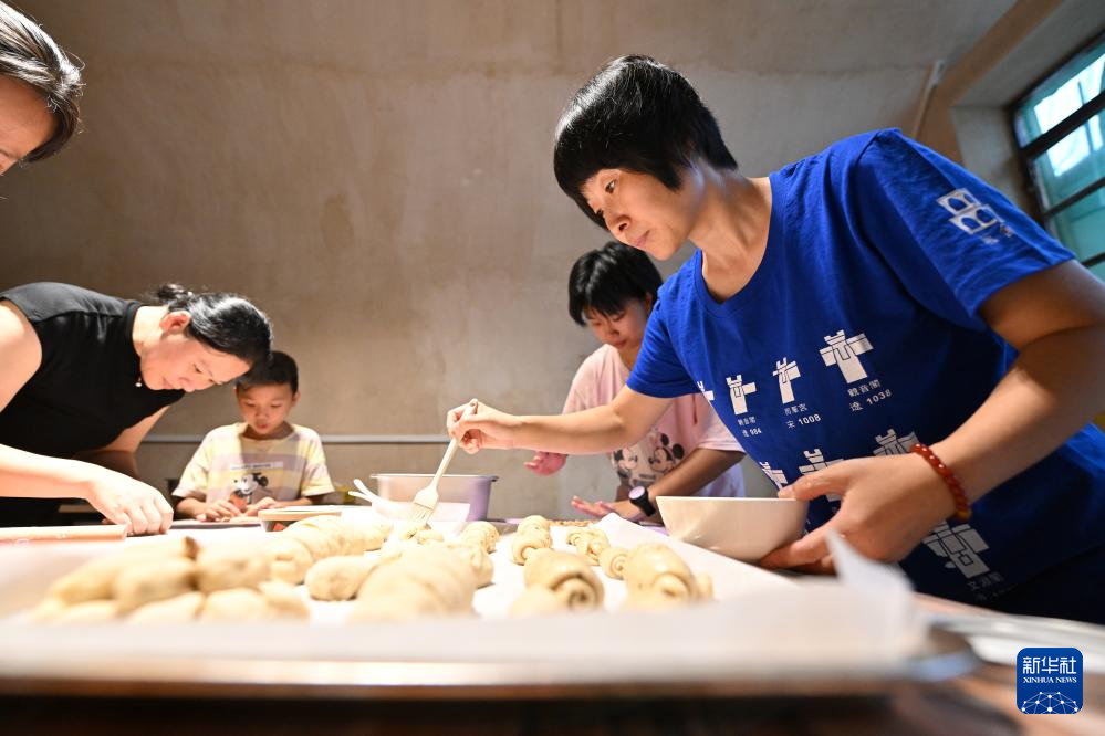在山西省平顺县榔树园村,魏美玲(右一)和住在民宿的客人一起做面包(7月23日摄)。