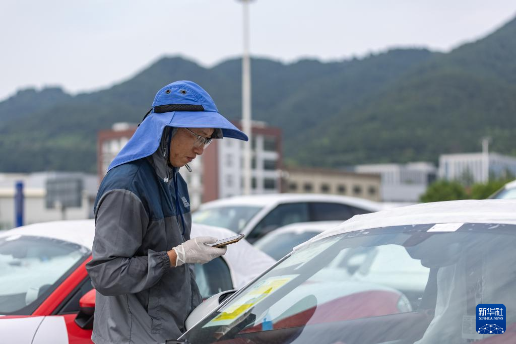 7月30日,在重庆国际物流枢纽园区,工作人员在重庆铁路口岸对进口整车进行检查(无人机照片)。