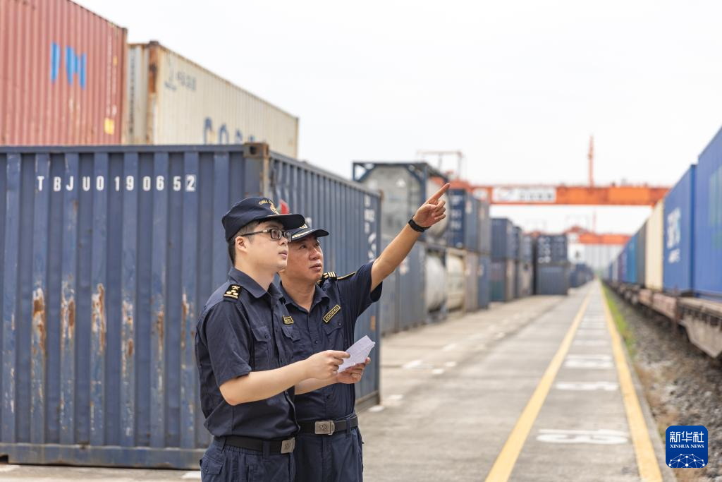 7月30日,在重庆国际物流枢纽园区,重庆海关所属渝州海关关员对一列即将发车的中欧班列实施现场监管。