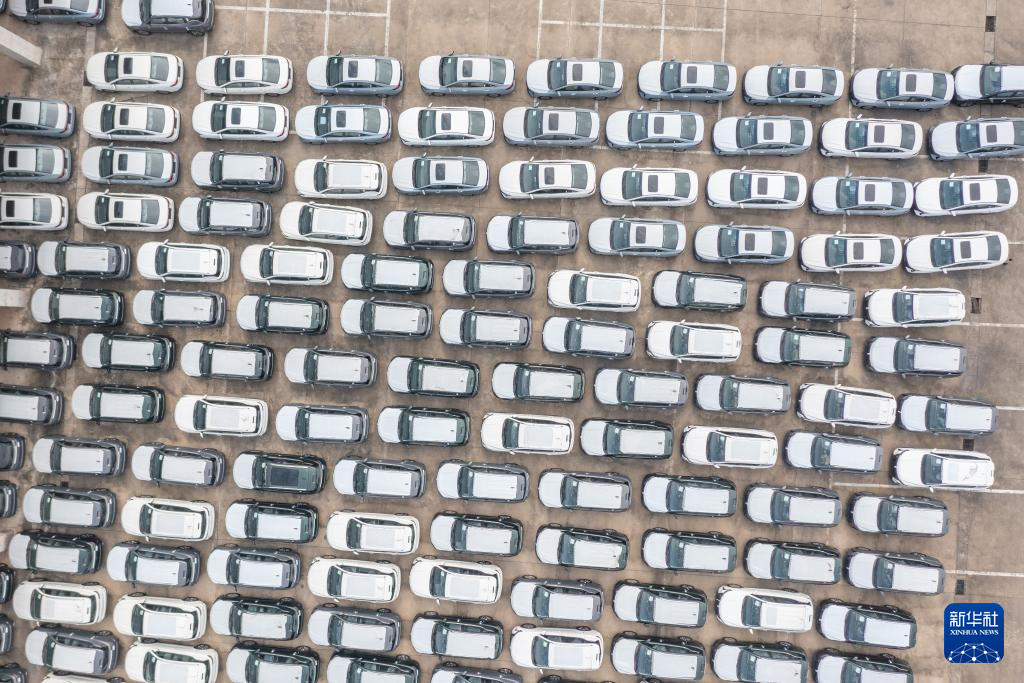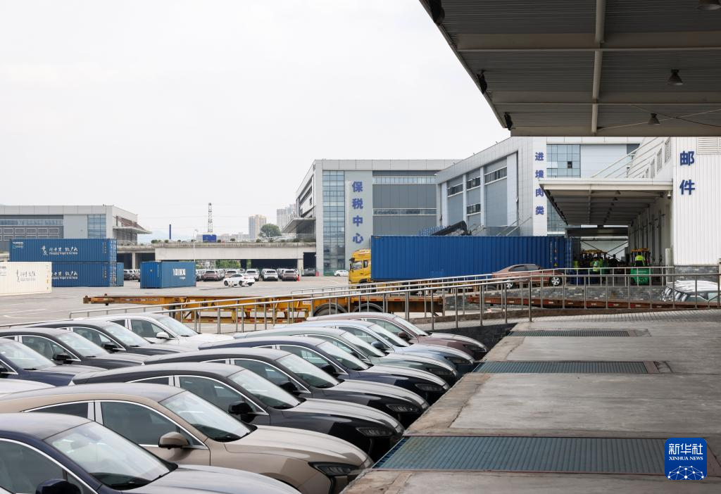 这是7月30日在重庆国际物流枢纽园区内的重庆铁路口岸拍摄的等待出口的汽车(无人机照片)。