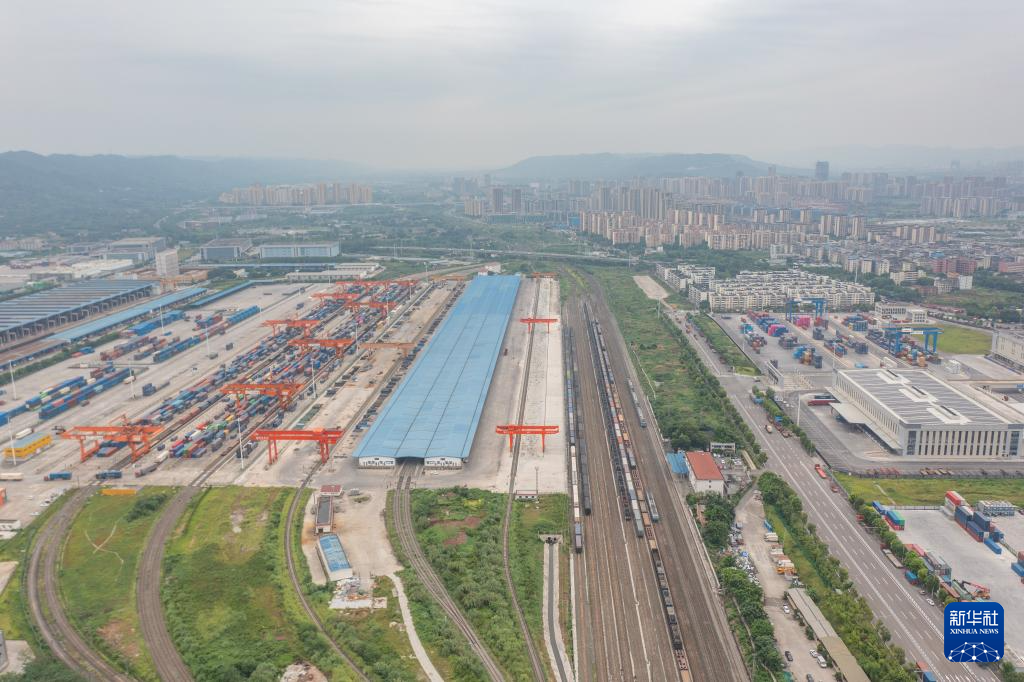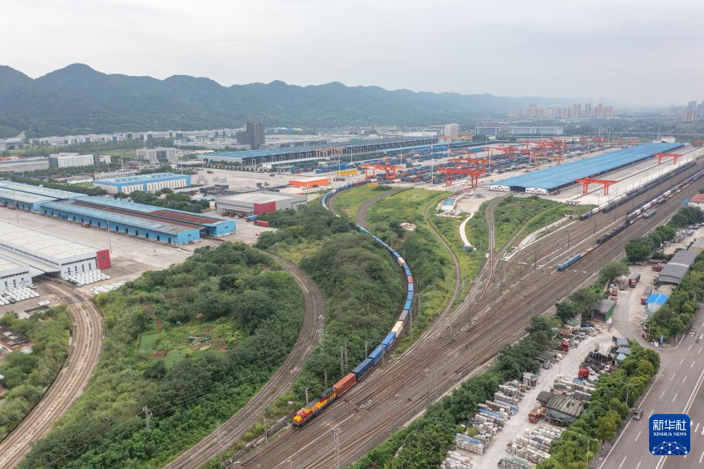 7月30日,在重庆国际物流枢纽园区,一列装载机械设备、汽车和笔记本电脑的中欧班列从重庆团结村中心站驶出(无人机照片)。