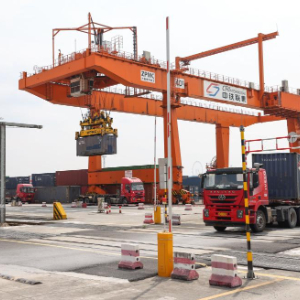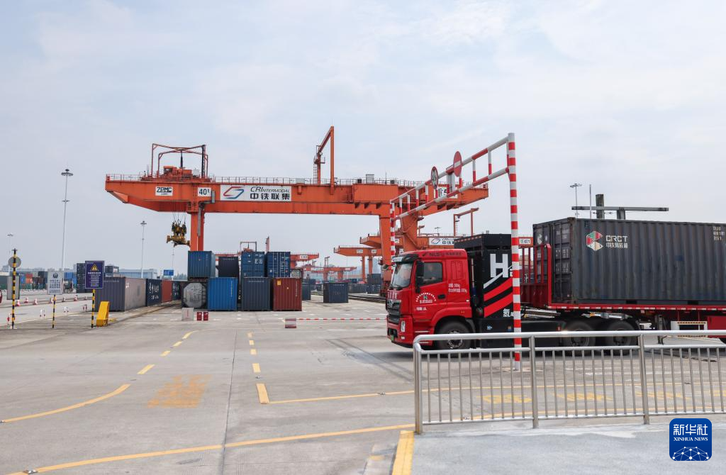 7月30日,在重庆国际物流枢纽园区,转运卡车在陆海新通道重庆无水港转运集装箱。