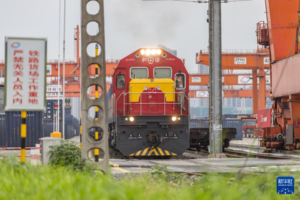 7月30日,在重庆国际物流枢纽园区,一列装载机械设备、汽车和笔记本电脑的中欧班列从重庆团结村中心站驶出。