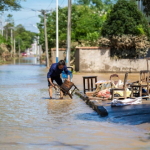 7月31日,在湖南省湘潭县河口镇华中村,村民在清扫房屋前的淤泥。