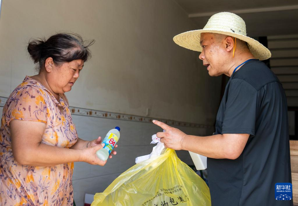 7月31日,在湖南省湘潭县易俗河镇新塘村,村干部(右)给村民发放消毒用品。