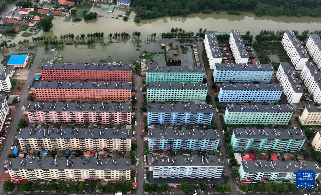 这是7月31日拍摄的太平湾街道部分水淹区域以及鸭绿江水面(无人机照片)。