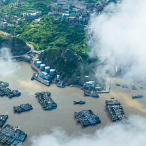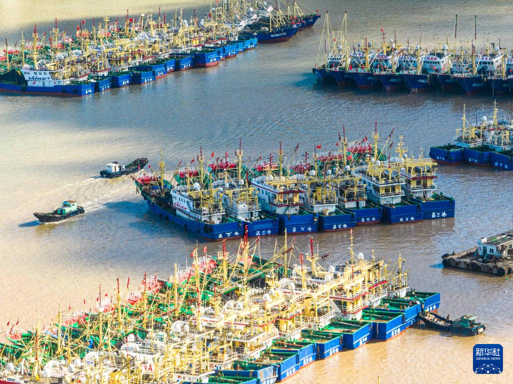 7月31日,浙江省温岭市石塘镇钓浜港内的渔船整装待发(无人机照片)。