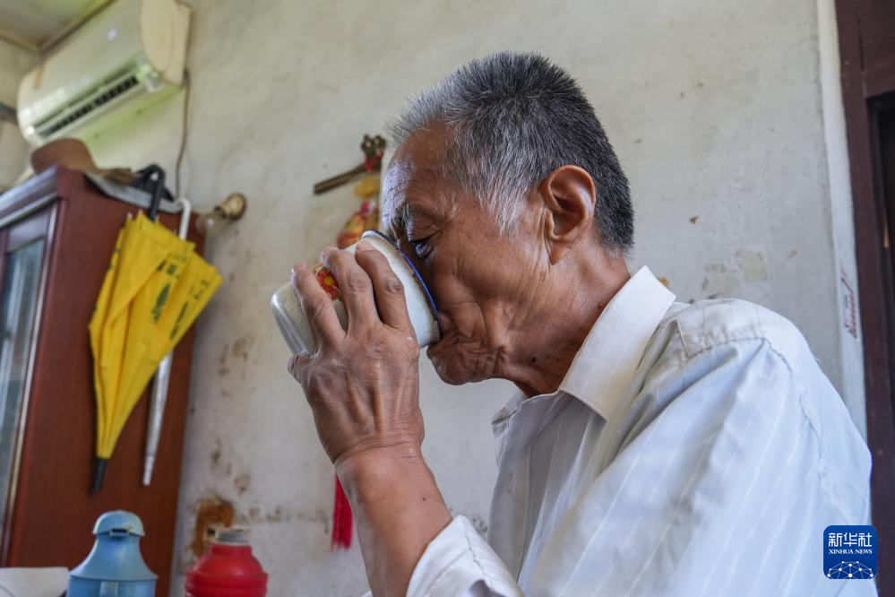 课间间隙,马如松老人在喝水休息(7月31日摄)。